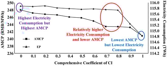 First of all, the impacts of different CI coefficients on market regulation are analyzed, and a proper value of the CI coefficient is selected for further study about the simulation and regulation of the market operation. Figure 7 illustrates impacts of varying CI coefficients on the average market clearing price and the total electricity consumption under corresponding optimal market regulation scenarios. If the CI coefficient turns to 0, in this case, in Formula (4) equals 0, and then turns into . Under this circumstance, the objective of optimal market regulation could be described as electricity consumption maximization. As can be seen from Figure 7, when the CI coefficient is 0, the electricity consumption under optimal regulation is the highest compared to that of the different CI coefficients. However, the average market clearing price is also the highest since MPI is not considered by policy makers when . As the CI coefficient increases, MPI plays more important role when regulating the market operation. Thus the average market clearing price and the electricity consumption in the market both decrease as the CI coefficient increases. If the CI coefficient turns to 1, in this case, in Formula (4) equals 1, and then turns into . Under this circumstance, the objective of optimal market regulation could be described as the minimization of the average market clearing price.