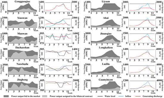 More specifically, the optimal levels of bilateral contracts and the corresponding optimal operation of the giant cascaded hydropower stations are illustrated in Figure 8. Since Xiaowan and Nuozhadu have good regulating abilities (annual or plurennial) and huge storage capacities (, ), they can reallocate the inflow and adjust their operation schedules between different months. Therefore, the monthly operation schedules of Xiaowan and Nuozhadu have great influences on the overall generation capacity of LR and the entire system as well. Manwan, Dachaoshan, and Jinghong also have good regulating abilities (seasonal or annual), but their storage capacities are relatively small, as shown in Table 1. Thus they can adjust their monthly operation schedules to optimize their profit to some extent, but they have little influence on the generation capacity of the system throughout the year. Gongguoqiao and all hydropower stations along the JR have poor regulating abilities on the monthly scale (daily or weekly), which means that they can only reallocate the inflow within a week or a day. Thus, in order to maximize their profits, they usually remain operating at normal high water levels throughout the year and generate according to the inflow. Moreover, from Figure 8, we can tell that sometimes the inflow exceeds the generating discharge in flood season, but the water level remains unaltered. That is mainly because such stations already generate the maximum power output, so the surplus inflow results in water spillage due to their poor regulating abilities. In terms of thermal power stations, their operating costs are much higher than those of hydropower station, so they are not competitive in hydro-dominated environments. However, in the transition period from a regulated power system to a deregulated one, thermal power is important for ensuring the security of the power system, since thermal power stations are close to the load center. Thus, they keep generating at minimum power output because of the setting of constraint conditions.