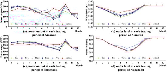 Generating schedules of Xiaowan and Nuozhadu under different regulation scenarios: (a) power output at each trading period of Xiaowan; (b) water level at each trading period of Xiaowan; (c) power output at each trading period of Nuozhadu; (d) water level at each trading period of Nuozhadu.