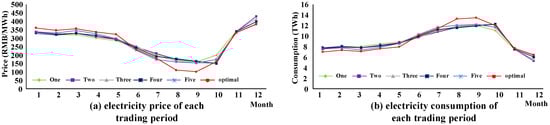 The monthly electricity consumption and market clearing price under different regulation scenarios: (a) electricity price of each trading period; (b) electricity consumption of each trading period.