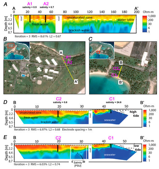 Locations and examples of Electrical Resistivity Tomography (ERT) profiles; (A) ERT profile A–A’ on the ocean side of Roi; (B) Map showing location of ERT profile A–A’; (C). Map showing location of ERT profile B–B’; (D). ERT profile B–B ́ on the lagoon side of Roi at high tide; (E). ERT profile B–B’ on the lagoon side of Roi at low tide. The locations of wells A1, A2, C1, and C2 are denoted in magenta. The pore water salinity profile shown in the lower image was obtained using a drive point piezometer, as described in Section 3.1.