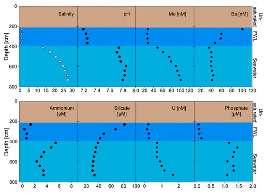 Although the ERT profiles clearly identified a distinct FWL floating atop seawater (Figure 2), they were also ground-truthed through geochemical pore water profiles (Figure 3) along the same lagoonal transect (B-B’, Figure 2). Most geochemical analyses recorded a sharp transition zone below 4 m depth, indicating a zone of mixing and a differentiation of unique water masses. Salinities sharply increased below 4 m from a freshwater environment (salinity = 1) to a saline environment (salinity = 28). Approximately fourfold similar increases between the water masses were measured in ammonium (NH+4), phosphate (PO4−3), molybdenum (Mo), uranium (U), and pH. On the other hand, barium (Ba) and silicate (Si) were highest near the surface and decreased with depth at more gradual rates.