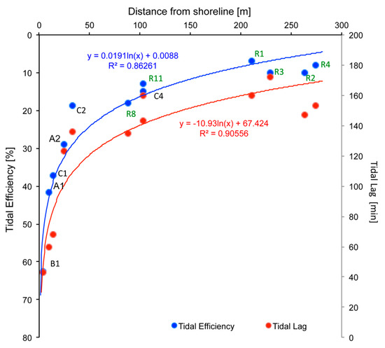 In order to evaluate the islands permeability and poroelastic storage capacity, a measurement of the attenuation of the tidal signal was captured as tidal efficiency and tidal lag. Tidal efficiency is the amplitude ratio between the magnitudes of the response seen in a well and the corresponding tides. Tidal lag is the time difference or phase lag between the tidal peak and the aquifer response peak. In general, this pressure signal is dampened by frictional losses related to the permeability and the poroelastic storage capacity of the aquifer. Consequently, it is important to assess tidal lag and efficiency in order to address the homogeneity of the aquifer’s substrate. Tidal efficiencies from the shallow monitoring wells ranged from 7 to 63%, while the tidal lag ranged from 40 to 170 min for wells measured at 3 m of groundwater depth relative to mean sea level. The measurements of tidal lag and efficiency attained from multiple coastal wells at 3-m depth fit well (R2 = 0.9) with the previously published data by Gingerich [42] (in Peterson [45]) and demonstrate that tidal attenuation is predictably dependent on the distance from the shoreline (Figure 4). Gingerich [42] demonstrated that tidal lag and efficiency were also dependent on the depth of each well, showing that deeper wells had higher efficiencies as the signal traveled through the Pleistocene layer and then upward through the Holocene layer.