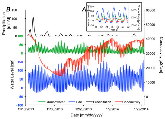 Time series plots showing tidal forcing of groundwater levels and salinity (Well C1), as well as the observed response to a large rain event. (A) From 11 November 2013 through 29 January 2014. (B) From 1 December through 4 December 2013. Precipitation gauge data available from NASA/RTS (2017) [46].