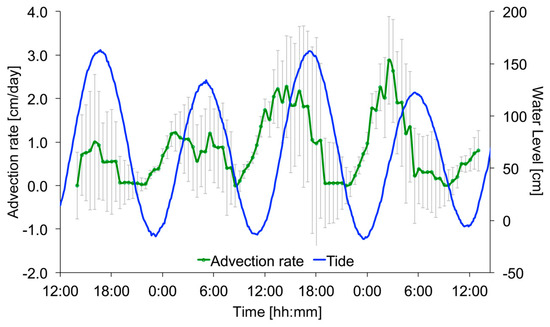 Time series showing ocean water levels (tides, in blue) and the computed submarine groundwater discharge (SGD, in green) advection rates. The error bars denote ± 1 standard deviation.