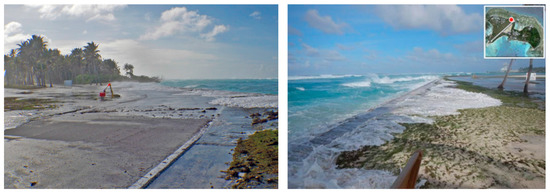On 2–3 March 2014, a series of large waves struck Roi-Namur, resulting in wave-driven flooding of the northern portion of the island. The oceanographic forcing that lead to this event has been documented in detail by Quataert et al. [27] and Cheriton et al. [48]. The large wave event, which had almost 7-m high waves with 15-s periods, coincided with a spring high tide and caused ocean water surface elevations, combined with wave run-up, to be 3.7 m above the reef flat, resulting in minor seawater flooding of select low-lying inland areas (Figure 7).