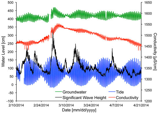 Observed variations in conductivity and ground water level in well A1 following an island overwash event driven by increased significant wave height during 2–3 March 2014.