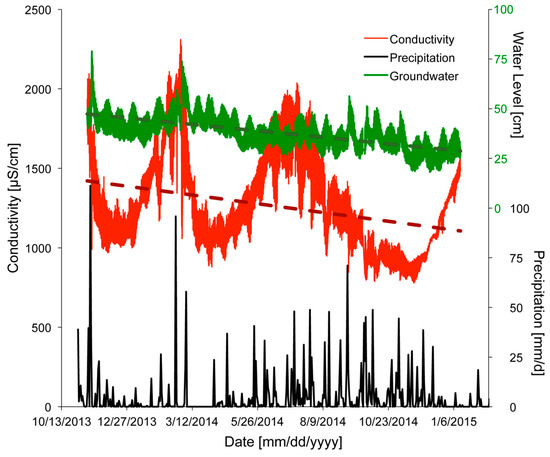Time series plot showing variations in rainfall (black), groundwater level (green), and conductivity of water (red) in well R3 observed between November 2013 and February 2015. Linear fits to the data are denoted by dotted lines.