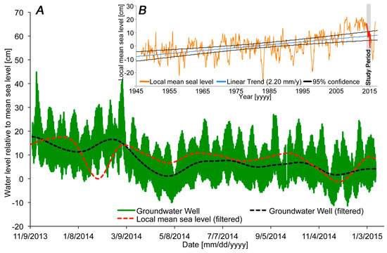By comparison to the beginning of the 16-mo monitoring period, the observed salinity and groundwater levels fell by approximately 29% and 68%, respectively (Figure 9). Although a water table is never truly stable, the observed negative trend in groundwater height is closely correlative to the varying levels of decline in mean sea level (average 59%) during this time period (Figure 10A). While mean sea level (MSL) measured by tide gauges since 1948 has, on average, been rising at Roi-Namur by 2.2 mm/year (Figure 10B), previous studies [50,51] have shown that during a significant El Niño-Southern Oscillation (ENSO) event a reduction in local mean sea level can occur. Because the monitoring period of this study fell into a time frame of a strong ENSO event, a decrease in MSL of 13.56 cm total or 11.56 cm/year was observed. Discrepancies between groundwater levels and the fall of MSL were most pronounced during January–March 2014 in Well R11 (Figure 10A). In conjunction with a large decrease in salinity during this time frame (Figure 10A), this discrepancy may indicate the presence of artificial recharge of the FWL as described by Gingerich et al. [13] that would yield higher groundwater levels than from natural sea-level forcing alone. For the study period after March 2014, a cross-correlation analysis of the MSL and the groundwater level data revealed a maximum correlation of 76% at a 5-h shift. However, a definitive answer to this question requires a more detailed analysis of artificial recharge volume, location, and timing.