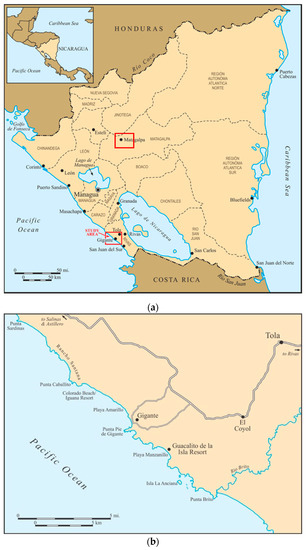 (a) Map of Nicaragua and study areas; (b) Map of Gigante and coastal Tola.