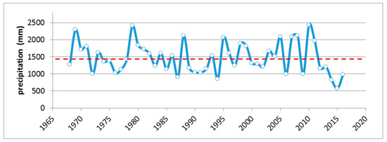 Annual rainfall for study area from [62,76]. Dashed horizontal line represents the mean of 1467 mm for the climatic series of 1968–2016.