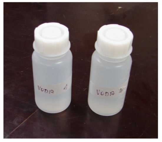 The PE vials (250 mL) were rinsed five times using demineralized water from a container (25 L); subsequently, for measurement purposes, four PE vials were filled with demineralized water and sealed (Figure 1). Both the samples acquired from the AQUA OSMOTIC system exhibited the conductivity of 1.2048 μS/cm.