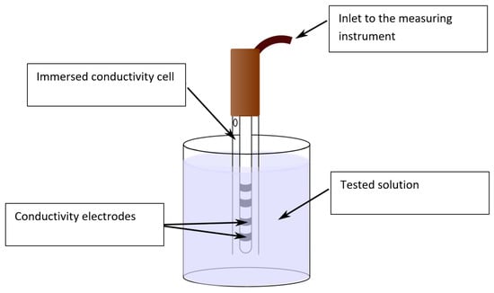The water conductivity was measured with a ZU 6985 (ILABO, Kyjov, Czech Republic) four-electrode conductivity cell (Figure 4), a device comprising a glass tube equipped with four platinum electrodes and a temperature sensor Pt1000. The measuring range corresponded to 1 µS, 1000 mS/cm; the constant of the cell equaled 1.19 cm−1 ± 1%; and the temperature range was between −20.0 and +100 °C. The conductivity cell was connected to a VMP 3 potentiostat (BioLogic, Seyssinet-Pariset, France). To carry out the measurement, we employed the frequency band of between 500 kHz and 1 Hz, with the peak-to-peak voltage of UP-P 500 mV. The potentiostat exhibited the resolution of 100 µV.