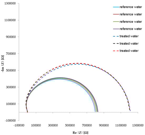 Ten measurement cycles with electrochemical impedance spectroscopy and the potentiostat were performed separately in the reference and treated water samples, within the frequency range of 1 Hz–500 kHz. After measuring the impedance spectrum of the reference water, we extracted the probe, mechanically eliminated the remaining liquid via centrifugal force, and measured the impedance spectrum of the treated water. The procedure was repeated ten times. The results yielded from the measurement of the impedance spectra of the treated and reference samples are shown in the Figure 5 (for simplicity, the diagram displays only seven curves; the remaining three follow the paths of some of the seven curves shown). The Figure 6 introduces the equivalent circuit diagram of the impedance characteristics to calculate the specific conductance in the measured samples. The results of the impedance analysis of the obtained data and the measurement conditions are summarized in Table 2 and Table 3.