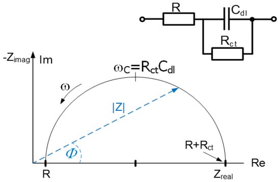 The normal and modified types of water constitute dynamic systems. Each measurement of the conductance or other properties of the water requires us to supply the dynamic system with energy and to assess its reaction with the selected physical quantity. The supplied energy, however, will influence the measured dynamic system; it is thus beneficial to utilize only minimum energy for the conductance measurement. For this purpose, we can advantageously employ electrochemical impedance spectroscopy and a potentiostat [,,,,,]. The latter tool separates the measured liquid sample from the voltage input signals in such a manner that the measurement is performed with merely minimal impact on the sample. Moreover, the potentiostat converts the current signals to voltage ones, which then facilitate the frequency response processing, and executes the impedance analysis. In general terms, impedance analysis is a very popular non-destructive measuring method providing diagnostic information on multiple electrochemical effects, including the charge transfer at the electrode–electrolyte boundary, reaction mechanisms, properties of electrode materials, battery charging status, and the stage of degradation of fuel cell catalysts []. Electrochemical impedance spectrum is most often represented in the complex plane, using a Nyquist plot.