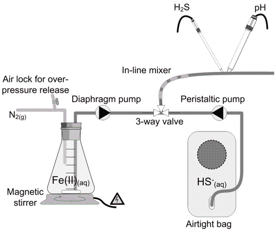 To minimize oxygen ingress into the system, liquids were conveyed in Masterflex Tygon® (Vernon Hills, Illinois, US) chemical tubing (internal diameter 3 mm). Prior to the experiments, oxygen ingress was measured and found to be negligible over the course of the experiments. The pump rate, in combination with the distance between the three-way valve and the sensors, determined the specific reaction time of sulfide precipitation, and the stoichiometry could then be determined from the measured dissolved sulfide. A magnetic stirrer kept the ferrous iron stock mixed. To avoid oxidation to ferric iron, the stock was kept under a nitrogen atmosphere.