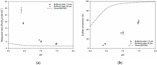 Addressing the stoichiometric ratio and conversion versus pH, the iron to sulfide ratio in Visual MINTEQ was set to 1.75 mol Fe (mol·S)−1, which corresponds to the average ratio of the samples at a reaction time of 1.5 s. When addressing the differences in reaction stoichiometry and conversion for wastewaters of different characteristics and buffered water at pH 7, the iron to sulfide ratio in Visual MINTEQ was set to 1.85 mol Fe (mol·S)−1. This value was chosen as it corresponded to the average value of the buffered waters used for comparison. In both cases, the ferrous iron concentration was fixed and sulfide concentrations were varied to yield the desired ratios.
