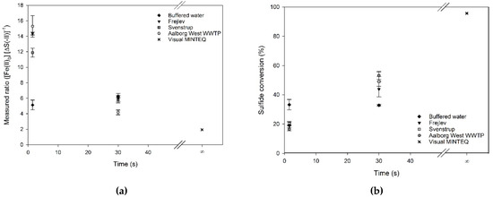 The stoichiometric ratios for wastewater at a reaction time of 1.5 s were 2.5–3 times higher than those for the buffered water. However, at a reaction time of 30 s, this difference disappeared and the ratios showed values in the same range as for the buffered water. Compared to the 1 mol Fe (mol·S)−1 theoretically needed according to Equation (1), and the 1.94 mol Fe (mol·S)−1 predicted by the equilibrium modeling, the obtained ratios at 1.5 and 30 s reaction times were 5–15 and 2.5–7.5 times higher, respectively.