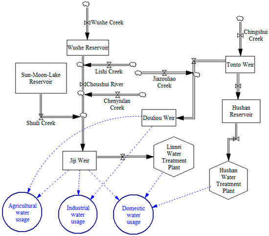 The stream flows are used as the inputs of the water supply system dynamics model. The system dynamics model is developed to simulate the allocation of regional water resources. The relationship between the water use of a company and that of the regional system can be clearly identified using the system dynamics model. It is of great use for a company to recognize whether the source of water resources is affected by the concerned hazard and which users have large water demands. This study uses the modeling tool of Vensim [17] to build the water supply system dynamics model based on the layout of the hydraulic facilities and operation rules of the reservoirs and weirs, which define the amount of power generation and water rights of different users. The water supply system dynamics model of the water allocation in the Chuoshui River watershed is shown in Figure 2.