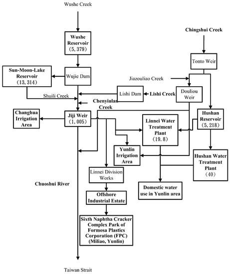 There are two reservoirs in the Chuoshui River watershed. Wushe Reservoir is located in Wushe Creek, which is the upstream of Chuoshui River, with a drainage area of 216 km2. Sun-Moon-Lake Reservoir is an off-site reservoir with a drainage area of 520 km2. Wushe Reservoir is mainly used for power generation, whereas Sun-Moon-Lake Reservoir provides domestic and agricultural uses in addition to power generation. The discharging principles of the two reservoirs are based on the water level and operation rules of the reservoirs. Moreover, Linnei Water Treatment Plant provides most of the public use in Yunlin with the capacity of 198 thousand cubic meters per day. Based on the operation manual of Jiji Weir, the public and agricultural water uses are first supplied according to the ratio of water-right registrations, and the remainder is allocated to industrial use.