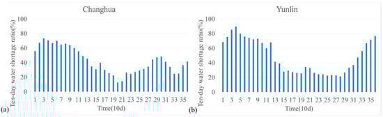Water shortage ratio (R) in Changhua (a) and Yunlin (b) for agricultural water use.