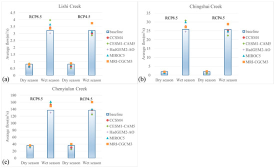 Changes of flows of Lishi Creek (a), Chingshui Creek (b), and Chenyiulan Creek (c) in the wet and dry seasons under baseline and future scenarios.