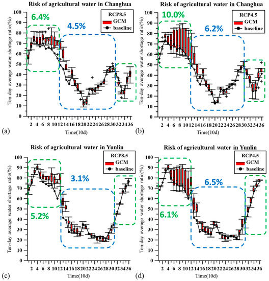 Water shortage ratio (R) of the irrigation water in Changhua under RCP 8.5 (a) and RCP4.5 (b) and in Yunlin under RCP 8.5 (c) and RCP4.5 (d).