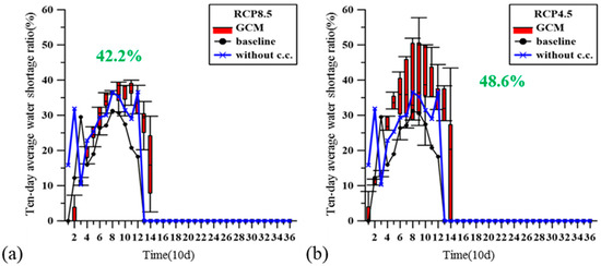 Water shortage ratio (R) of Formosa Plastics Corporation (FPC) under RCP 8.5 (a) and 4.5 (b) (The abbreviation without c.c. means the baseline weather data and future water demand are used in simulation).