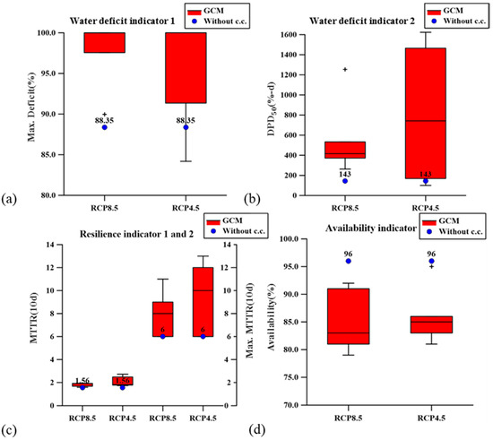 The simulated water shortage ratios of FPC in the period of 2021–2040 are shown in Figure 9. The no-climate-change scenario implies using the generated weather data of the baseline with the estimated future water demands. In the no-climate-change scenario, the ratios in the dry seasons still increase compared to the baseline because of the increased water demand of FPC. The increasing water shortage ratios are found for most climate projections compared to the baseline with 42.2% and 48.6% on average for RCP 8.5 and 4.5, respectively. The increase in water shortage ratio for FPC is more than four times of that for the agricultural use, which provides sufficient motivation to FPC to invest in adaptation planning. The indicators of water shortage are analyzed and shown in Figure 10. The results show that Max. R, DPD50, and the average and maximum time for a malfunctioned system to work are most likely to increase, and the percent of average function states of the system decreases. Thus, the water shortage becomes more severe, whereas the resilience and availability of that decrease in the future climate and social-economic scenarios.