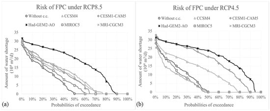 Probabilities of exceedance of the annual maximum water shortage amounts under RCP 8.5 (a) and 4.5 (b).