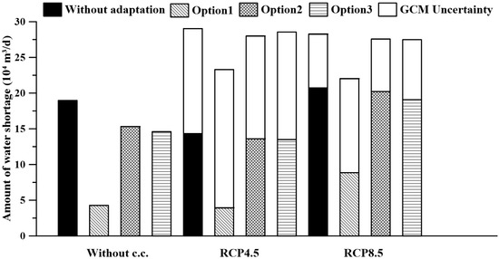 The study evaluates the effects of three adaptation options on reducing the risk of water shortage of FPC. The effects of the adaptation options through literature review and modeling estimation are shown in Table 7. Then, the water supply system dynamics model is used to examine the risk of FPC. The results are compared with the amounts of water shortage in 2021–2040 without adaptation to examine the relative performances of the options. The effects of the no-adaptation option are unchanged as the results in the future climate risk assessment. This study evaluates the effects of the options by calculating the water shortage of the ten-year return period as severe events affect the production, which is from the 10% water supply reduction of industries in 2015. The amounts of water shortage for no-climate-change, RCP 4.5, and RCP 8.5 scenarios are shown in Figure 12. The first option is the most effective one in reducing Max. R and DPD50 and increasing the resilience and availability. More specifically, the first option reduces 146.8 thousand cubic meters per day, whereas the second option reduces 36.3 thousand cubic meters per day in a no-climate-change scenario. The reason is that the waste-water reuse and sea-water desalination directly support the water use of FPC, and the smart agricultural management primarily benefits the other water users. In future climate and social-economic scenarios, the first option reduces the water shortage amounts 33–44% per day in the return period of ten years. As a result, the option of waste-water recycling and desalination is recommended for FPC.