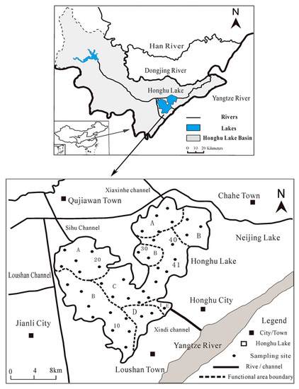 Honghu Lake serves critical functions in flood regulation, fishery production and water supply provisioning for local industry and agriculture development. However, artificial hydrological regulation and intensified fish farming have resulted in a significant decrease in the water level and a serious deterioration in water quality and aquatic vegetation, which have had critical influences on the aquatic environment and ecosystem [31]. Following Wang et al. [32], Honghu Lake was divided into five area types: river inflow areas, enclosure culture areas, an open water area, a lake-protection area, and an area connecting to the Yangtze River (Figure 1). The southeastern part of Honghu Lake is connected to the Yangtze River, and a large proportion of the enclosure culture areas is devoted to aquaculture development. The aim of the lake protection area is to protect the ecosystems and aquatic vegetation where minimal human disturbance occurs. The majority of the residential, industrial and tourism developments surround the river inflow areas, where much rice and cotton is planted.