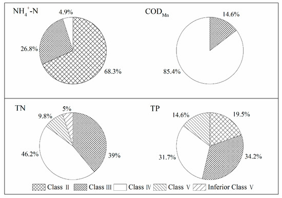 The collected data regarding the seven water quality parameters and submerged aquatic plant biomass are summarized in Table 1. According to the environmental guidelines of surface water quality in China (GB3838-2002), surface water quality can be classified into five groups: clean water Class I (excellent); Class II (good); Class III (ordinary); Class IV (poor); and Class V (bad) (see Table A1 in Appendix A). According to the environmental function zoning of water bodies in Hubei Province, China, the target for surface water quality in Honghu Lake is Class III. During the examined years, the average concentrations of TN, TP and CODMn exceeded this target (Table 1). As shown in Figure 2, 61%, 46.3%, 85.4% and 4.9% of the 41 samples in Honghu Lake exceeded the Class III water quality target in terms of TN, TP, CODMn, and NH4+–N, respectively. For the CWQ, 7.3%, 70.7%, 17.1% and 4.9% of the 41 monitoring sites could be classified as Class III, Class IV, Class V and inferior Class V, respectively. The coefficient of variation (CV) for transparency, NH4+-N, TN, TP and biomass indicated that these parameters changed significantly across sampling sites over the three seasons, as shown in Table 1.