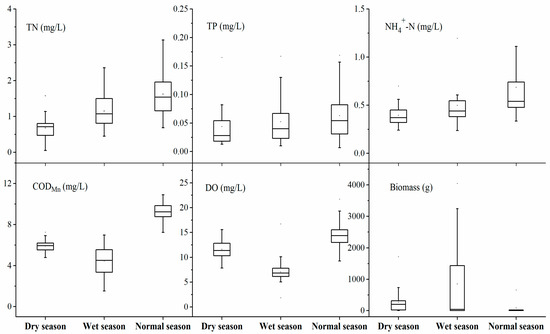 The seasonal variation in water quality parameters and submerged aquatic plant biomass was further examined for different seasons, as shown in Figure 3 and Tables S1–S4. The mean concentrations of DO, NH4+-N, TN, TP and CODMn were all highest during the normal season (Figure 3). The degree of pollution was in the following order: CODMn > TP > TN > NH4+–N > DO in the dry season, TN > TP > CODMn > NH4+–N > DO in the wet season and CODMn > TN > TP > NH4+–N > DO in the normal season. The highest mean value of CODMn observed in the normal season was 9.24 mg·L−1. The highest mean biomass value observed in the wet season was 852.5 g, which was approximately 3 and 10 times higher than those in the dry and normal seasons, respectively. Seven kinds of submerged aquatic plants, including Stuckenia pectinata (L.) Börner sago pondweed, Myriophyllum verticillatum, Ceratophyllum demersum L., Potamogeton malaianus, Potamogeton maackianus, Vallisneria natans, and Hydrilla verticillata, were collected in Honghu Lake during dry and wet seasons. However, Vallisneria natans were not collected in normal season. In all, Myriophyllum verticillatum, Ceratophyllum demersum L. and Stuckenia pectinata (L.) Börner sago pondweed were the three dominant species, and accounted for 96%, 95% and 76% of total biomass of submerged aquatic plants in dry, wet and normal seasons, respectively (see Supplementary Materials Table S5). The mean pH values for the all samples collected during the three seasons were within the permissible standard range of between 7.39 and 8.69, which indicated that the water in Honghu Lake was alkaline. Altogether, approximately 56%, 68% and 100% of all sampling sites exceeded the water quality target (i.e., Class III) during the dry, wet and normal seasons, respectively. The water quality was the worst in the normal season.