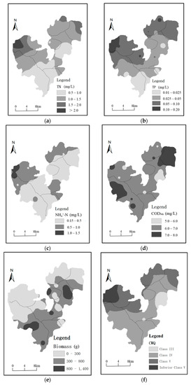 Spatial variability in water quality parameters, biomass, and composite water quality: (a) TN; (b) TP; (c) NH4+–N; (d) CODMn; (e) Biomass; and (f) CWQ.