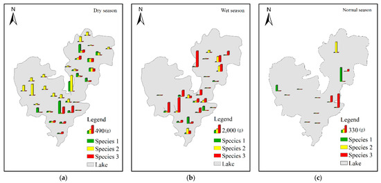 The distribution of submerged aquatic plants biomass for different species in three seasons. (a): dry season; (b): wet season; (c): normal season. Species 1: Myriophyllum verticillatum; Species 2: Stuckenia pectinata (L.) Börner sago pondweed; and Species 3: Ceratophyllum demersum L.