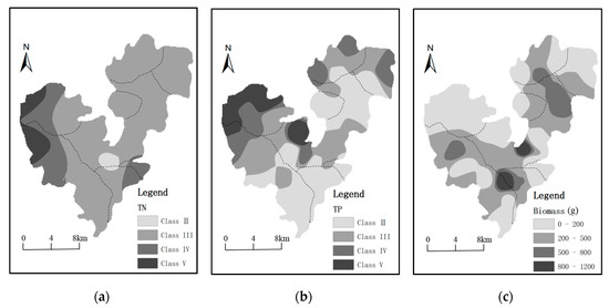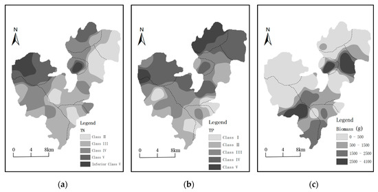 Spatial variability in TN, TP and biomass in the wet season: (a) TN; (b) TP; and (c) Biomass.