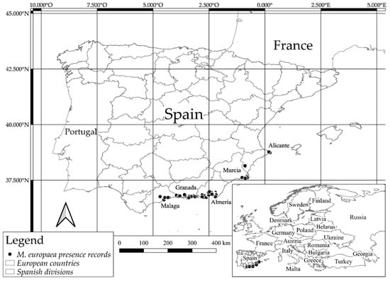 Presence data were collected through a huge bibliographical search combined with intensive fieldwork developed between 2011 and 2018 in Almería, Granada, Malaga, Murcia and Alicante provinces. Field data were geo-referenced using a GPS device (Garmin GPSMAP 60CX, 2 m error). Furthermore, digital sources were checked to gather distribution information on the species, such as GBIF [], ANTHOS [], and FAME project (Database of Threatened Flora of Andalusia) [], and adding details about herbaria records (HUAL, GDA, GDAC, JAEN, MGC, and MUB). The bibliographical data, particularly those taken from the Internet, were carefully checked by QGIS [] and using the latest aerial orthophoto, to only process reliable information. In order to avoid errors and remove duplicated occurrence records all the information was carefully filtered. A total of 1819 geo-referenced presence records of M. europaea were selected (Figure 1). The dataset of presence records was analyzed by using a spatial autocorrelation analysis.