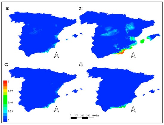 Bioclimatic data were downloaded from the Community Climate System Model (CCSM4) as the main reference for the distribution tests. This model simulates the global climate using four separate sub-models for the atmosphere, earth, oceans and sea ice []. These bioclimatic data had a 30-s resolution, except for the LGM, for which only data at 2.5 min were available. Each environmental variable map was adjusted to the Iberian Peninsula mask without Portugal.
