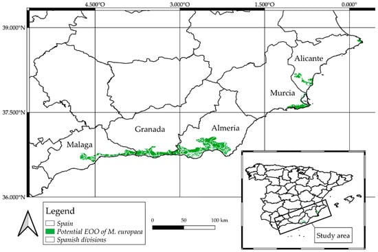 In the context of the present situation, the results for the M. europaea potential extend of occurrence (EOO) are expressed in two ways; values format by territory (see Table 2), and detailed distribution map (Figure 3).