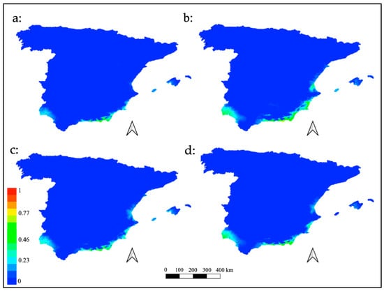 Future distribution models for M. europaea. Plots of the potential habitat projected into the future according to the representative concentration pathways: (a) RCP2.6; (b) RCP4.5; (c) RCP6.0; (d) RCP8.5.