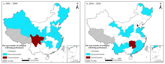 To more completely understand the spatial and temporal evolution differences of ecological welfare performance in different provinces and cities, we construct spatial Markov chain probability transfer matrices. By comparing the corresponding elements of the two matrices, this article explores the relationship between the transfer probability of the EWP type for a province and that for neighboring provinces and cities with or without the influence of the spatial background. First, the global Moran’s I index of EWP from 2003 to 2016 was calculated, and the spatial correlation test was conducted. The Moran’s I index of EWP in each year was positive (0.1978–0.3702) and passed the significance test at a confidence level of 5%. This shows that there is a significant positive correlation in the spatial distribution of China’s EWP and that the geographical spatial pattern is also one of the important factors that affect China’s EWP. By using ArcGIS, a spatial distribution map of the transfers of EWP types in 2003–2009 and 2010–2016 was created. Figure 3 shows the following. ① From 2003 to 2009, only Sichuan Province exhibited upward transfer of EWP, while the EWP remained unchanged in 16 provinces and cities, mainly distributed in the central region of China, and the EWP decreased in 13 provinces and cities located mainly in the eastern region of China. ② From 2010 to 2016, there were 2 provinces and cities with increasing EWP, namely, Hunan Province and Tianjin city. A total of 17 provinces and cities maintained the same ecological welfare performance type, and the EWP in 11 provinces and cities decreased, mainly in the central and western regions. These results indicate that although there was no significant improvement of the EWP in this period, the performance in most regions remained unchanged. Moreover, the downward shift of EWP types in western China was curbed, which had a certain spatial spillover effect.