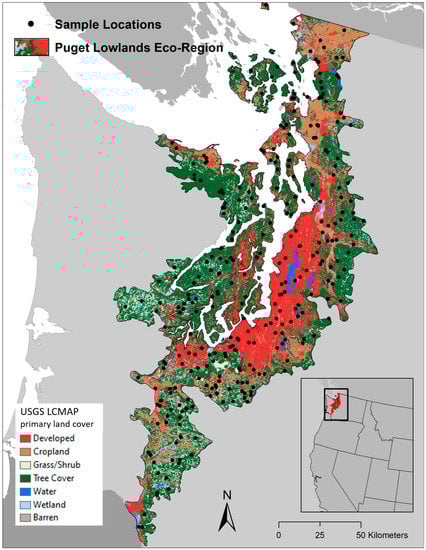 The reference data used for the comparison of LCM and SA area estimates were collected by the U.S. Geological Survey’s (USGS) Land Change Monitoring, Assessment, and Projection (LCMAP) initiative []. The objectives of LCMAP are to quantify and map land cover and land cover change within the conterminous United States (US) on an annual basis starting from 1985. Two key elements of LCMAP are estimating the area of land cover for each year (e.g., area of water, tree cover, cropland, wetland, etc.) and estimating the annual change in the area of the land cover classes. The LCMAP area estimates are produced from annual reference land cover labels determined by professional interpreters for a simple random sample of nearly 25,000 pixels (30 m × 30 m). Prior to initiating reference data labeling Supplementary Materials of the sample pixels, LCMAP conducted a pilot study in which seven trained interpreters independently assessed a simple random sample of 300 pixels from the Puget Sound region of Washington State within the US (Figure 1). These pilot study data were used for our comparative analyses of SA and LCM. From the seven land cover classes of the pilot study data, we selected forest and developed to represent common classes and wetland to represent a rare class (see Appendix A for definitions of the land cover classes). We also compared SA and LCM area estimates for three land cover change types, forest loss, forest gain, and developed gain.