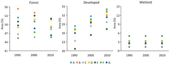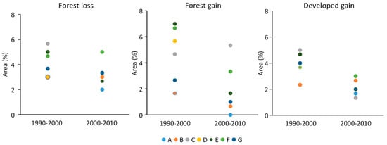 For forest, developed and wetland, the individual interpreter estimates were generally consistent over time (Figure 2). For example, interpreter B provided the highest area estimate for the forest class in both 1990 and 2000, and the second-highest estimate in 2010, whereas interpreter F tended to yield lower estimates than other interpreters in all three years. A similar pattern of relative consistency occurred for the developed class as interpreters C and E produced the smallest estimates, and interpreters A and F produced the highest estimates for all three years. For wetland, interpreters D and G provided the highest area estimates, and interpreter A obtained the lowest estimates for all three years. The estimated percent areas of change in land cover did not show as consistent of a pattern for the two change periods assessed (Figure 3), perhaps attributable to higher interpreter disagreement in assigning change class labels.