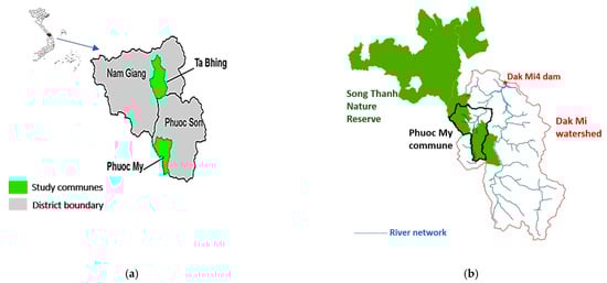 The study was conducted in Phuoc My commune of Phuoc Son district and Ta Bhing commune of Nam Giang district, Quang Nam province (15°35′0″ N–107°55′0″ E), South Central Coast of Vietnam (Figure 1a). The two communes are within the buffer zones of Song Thanh Nature Reserve and parts of main watersheds in South Central Coast region which supply water for several cities including Da Nang as the biggest city in Central Vietnam. For example, Phuoc My is part of Dak Mi watershed (Figure 1b), while Ta Bhing is part of Vu Gia-Thu Bon as a bigger watershed []. Phuoc My is situated at 223–446 m above sea level while Ta Bhing is approximately 100 m above sea level. Both communes are mountainous with flat areas concentrated at the feet of the mountains, along riverbanks.