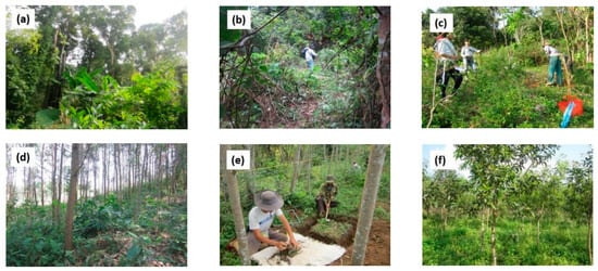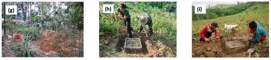 Vegetation cover and types in (a) natural forest, (b) regenerated forest, (c) agroforestry, (d) plantation of Acacia mangium x auriculiformis, (e) plantation of Melia azedarach, (f) plantation for Machilus odoratissima Nees, (g) home garden, (h) grasslands, and (i) upland annual crops.