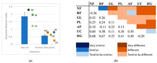 (a) Shannon-Wiener and (b) similarity index among habitats.