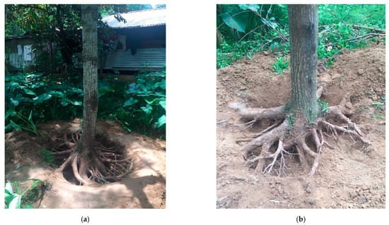 Distribution of proximal roots of Melia azedarach in (a) home garden and (b) forest plantation.
