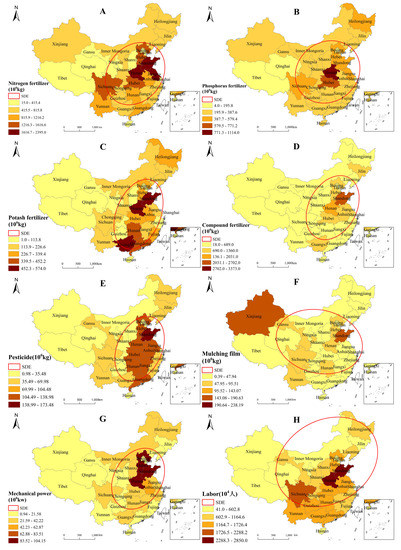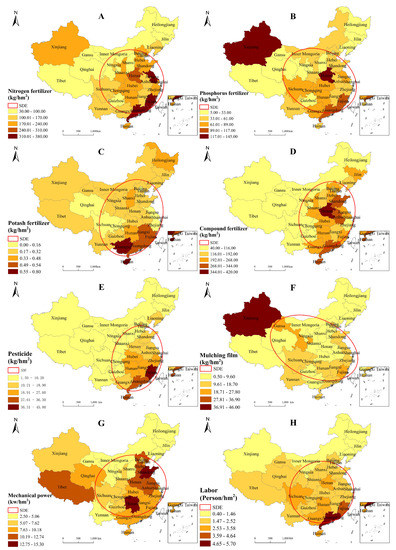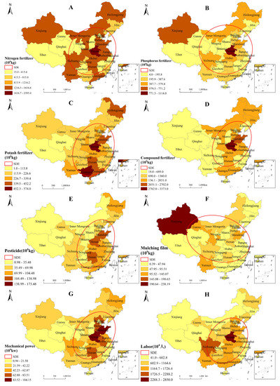 In terms of specific inputs, in contrast to the distribution of total input (Figure 2 and Figure 3), the inputs of nitrogen fertilizer and pesticide per unit area are increasingly concentrated in five provinces along the southeast coast (including Jiangsu, Zhejiang, Shanghai, Min, and Guangdong). In addition, both phosphate fertilizer and the plastic film showed an SDE with an obvious northwest orientation. Represented by the high value of phosphate fertilizer and plastic film in Xinjiang Province, the trend was further increased.