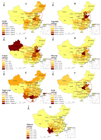 Figure 6 and Figure 7 represent the output on arable land in 2008 and 2018, respectively. The subfigures A-G illustrate the output of grain, vegetable, cotton, oil crop, sugar crop, fruit and tobacco, respectively. From the perspective of the distribution pattern, each crop has obvious clustering directivity. Except for tobacco, sugar, and cotton, the yields of other crops on the Huang-Huai-Hai Plain accounted for more than 35%. Compared with other areas, the Huang-Huai-Hai Plain maintained a very high level of output. Specifically, the proportion of fruit yield in this region to the whole country was up to 50.44%~52.59% (Figure 6F). Among them, the output of grain crops (Figure 6A) in the main producing areas was as high as 3.99 × 1011 kg, accounting for 75.50% of the national total, which increased to 78.74% in 2018, occupying an absolute advantage.